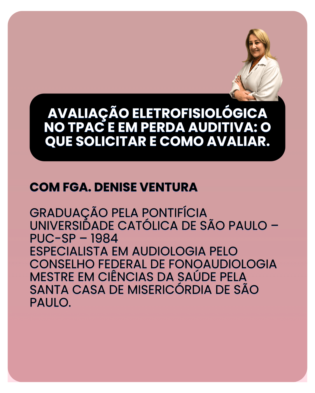 Tenho Pós-Doutorado em Fonoaudiologia e Especialização em Audiologia. Trabalho há 14 anos com Processamento Auditivo Central e aparelhos auditivos.